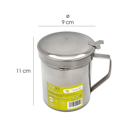 Grasera Acero Inoxidable Para Carne, Aceitera Aceite Usado 0,5 lts. Con Colador y Tapa, Recipiente Reciclaje Aceite Usado Carne