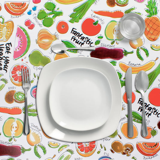 Mantel Hule Redondo Frutas Fantasia Impermeable Antimanchas PVC Ø 140 cm. Uso Interior y Exterior