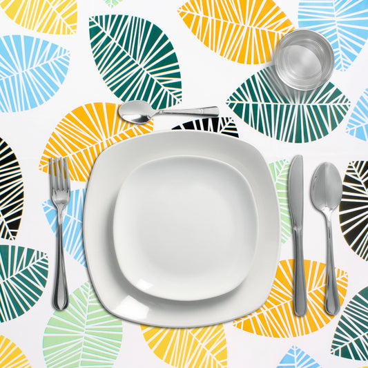 Mantel Hule Redondo Hojas Colores Impermeable Antimanchas PVC Ø 140 cm. Uso Interior y Exterior