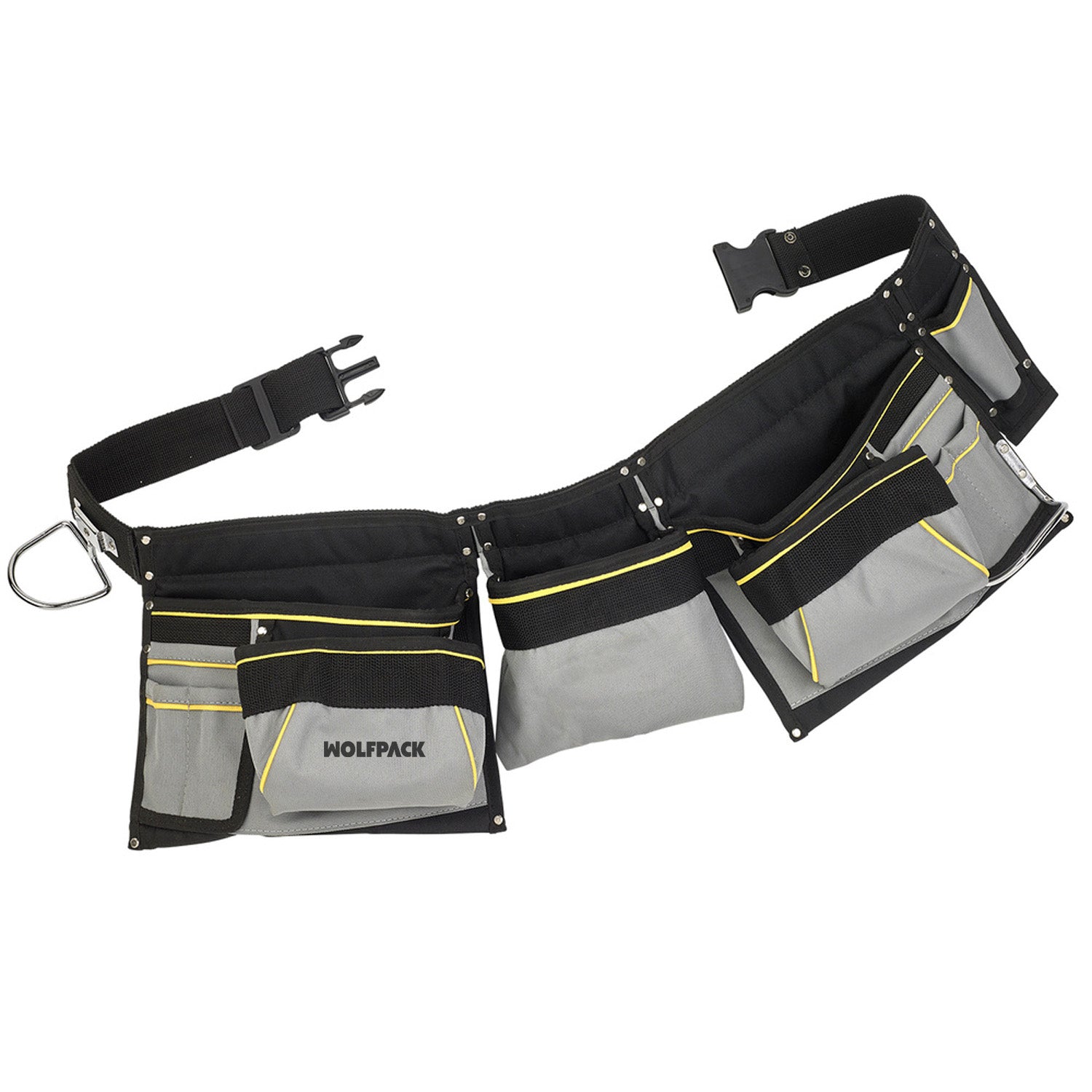 - Diseño práctico con múltiples compartimentos y colgador para martillo.