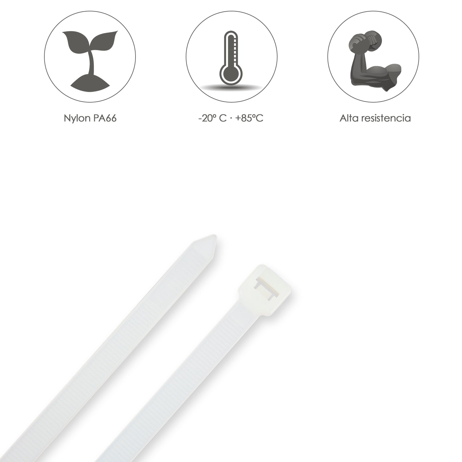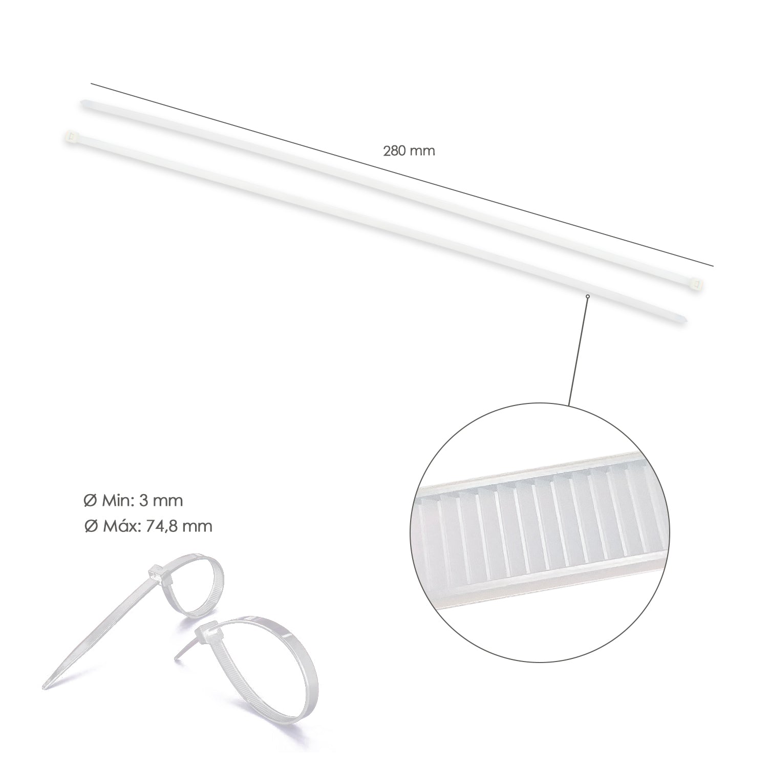 Brida Nylon 100%. Color Blanco / Natural 4,5 x 280 mm. 100 Piezas. Abrazadera Plastico, Organizador Cables, Alta Resistencia