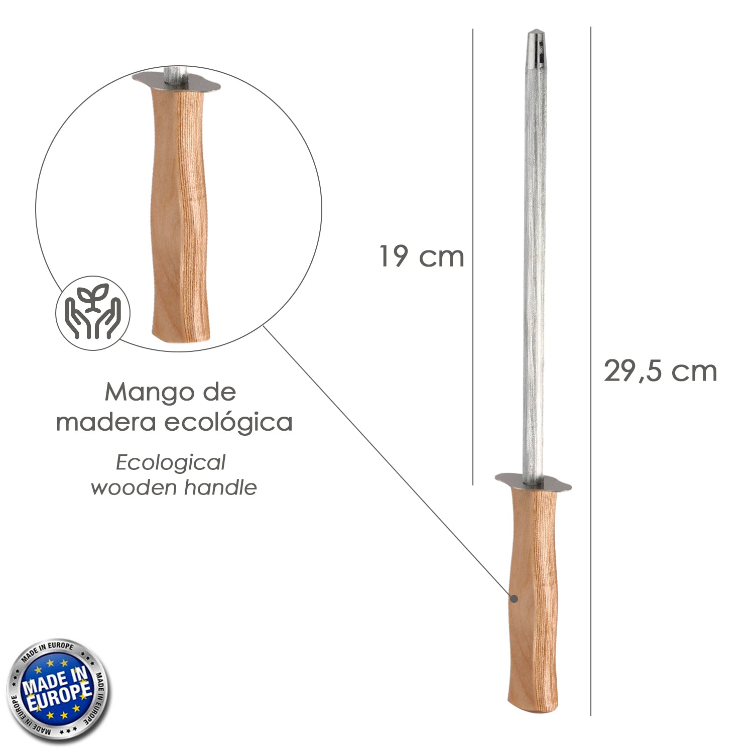 - Mango ergonomico realizado en madera ecologica.
