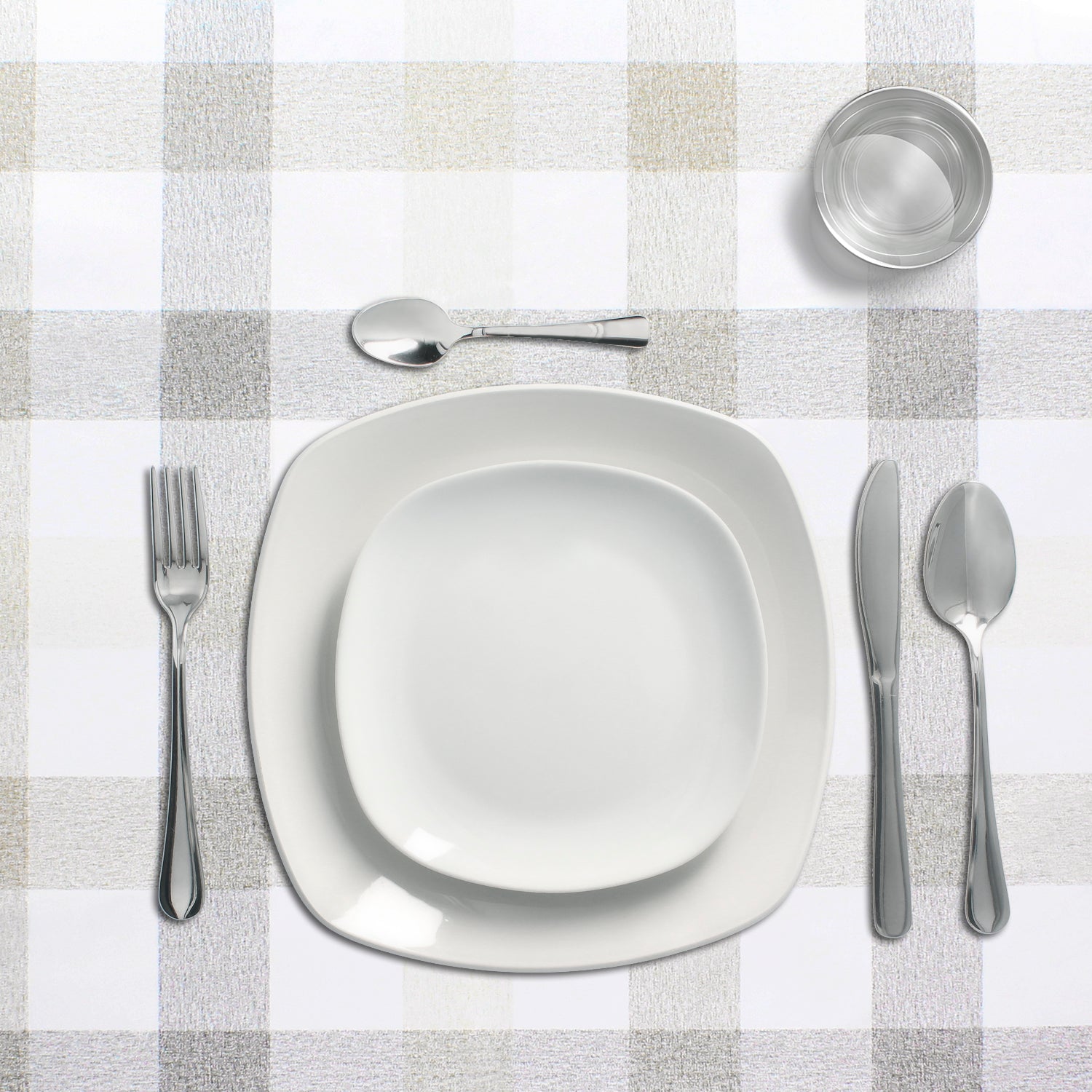 - Mantel Hule estampado en color blanco con formas cuadradas en tonos beige y grises. Diseño moderno y elegante para cualquier ocasión.