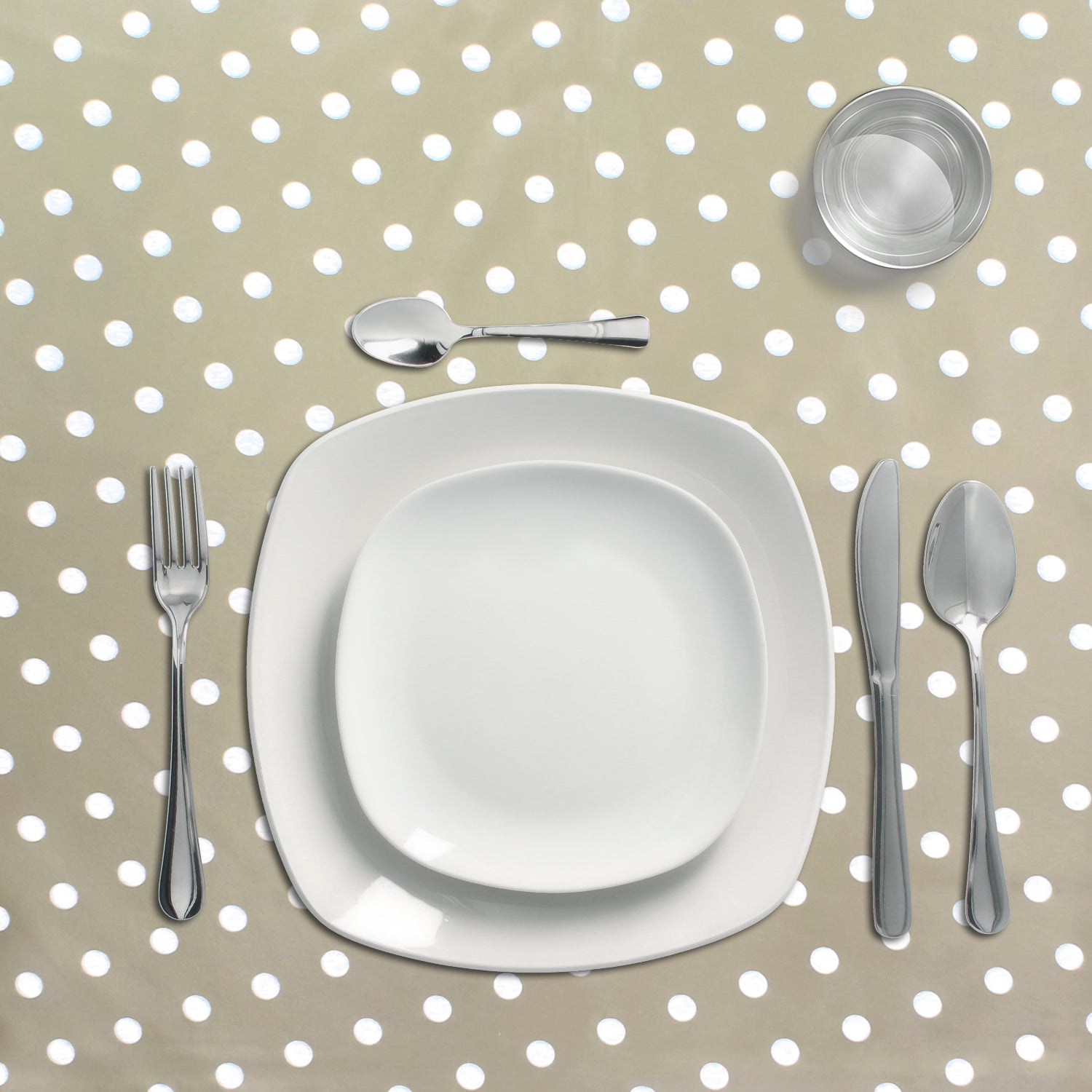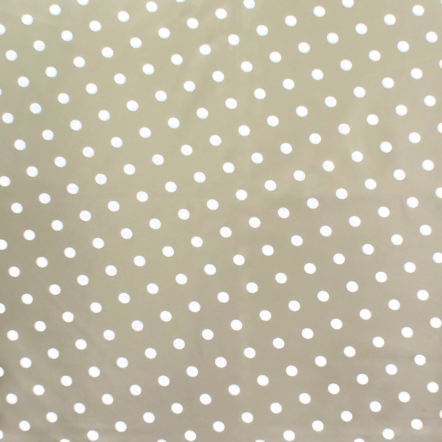 - Mantel Hule estampado en color beige con circulos blancos. Diseño moderno y elegante para cualquier ocasión.
