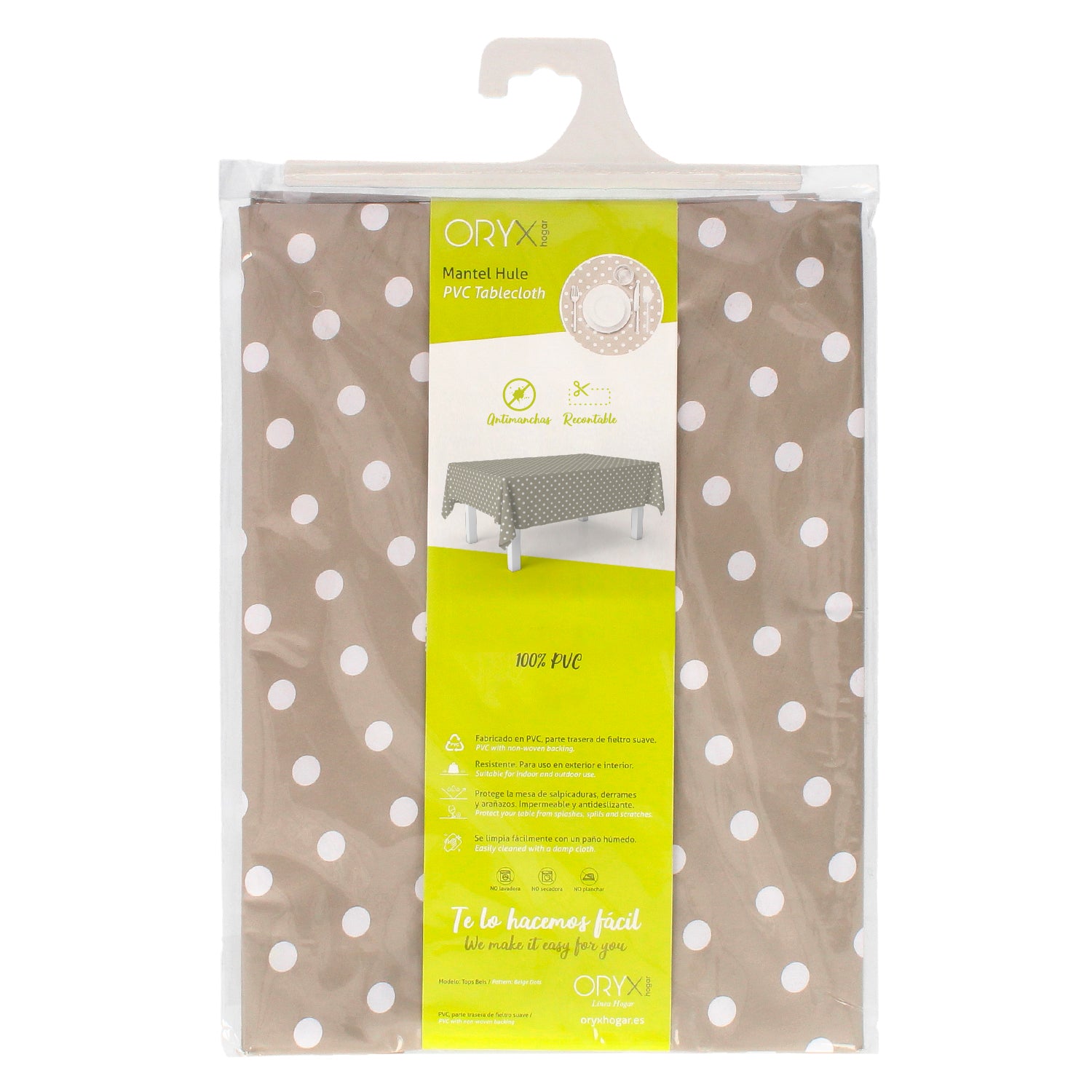 Mantel Hule Rectangular Topos Beige Impermeable Antimanchas PVC 140x250 cm. Recortable Uso Interior y Exterior