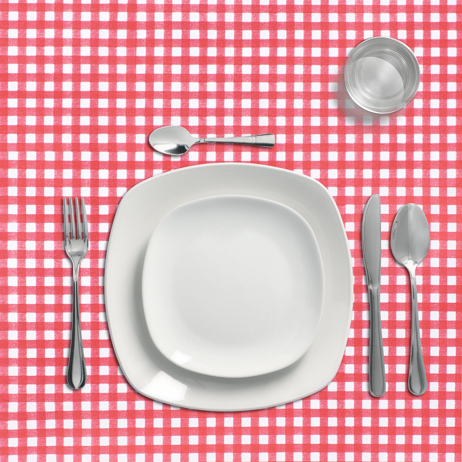 - Mantel Hule estampado en color blanco con formas cuadradas en rojo. Diseño moderno y elegante para cualquier ocasión.