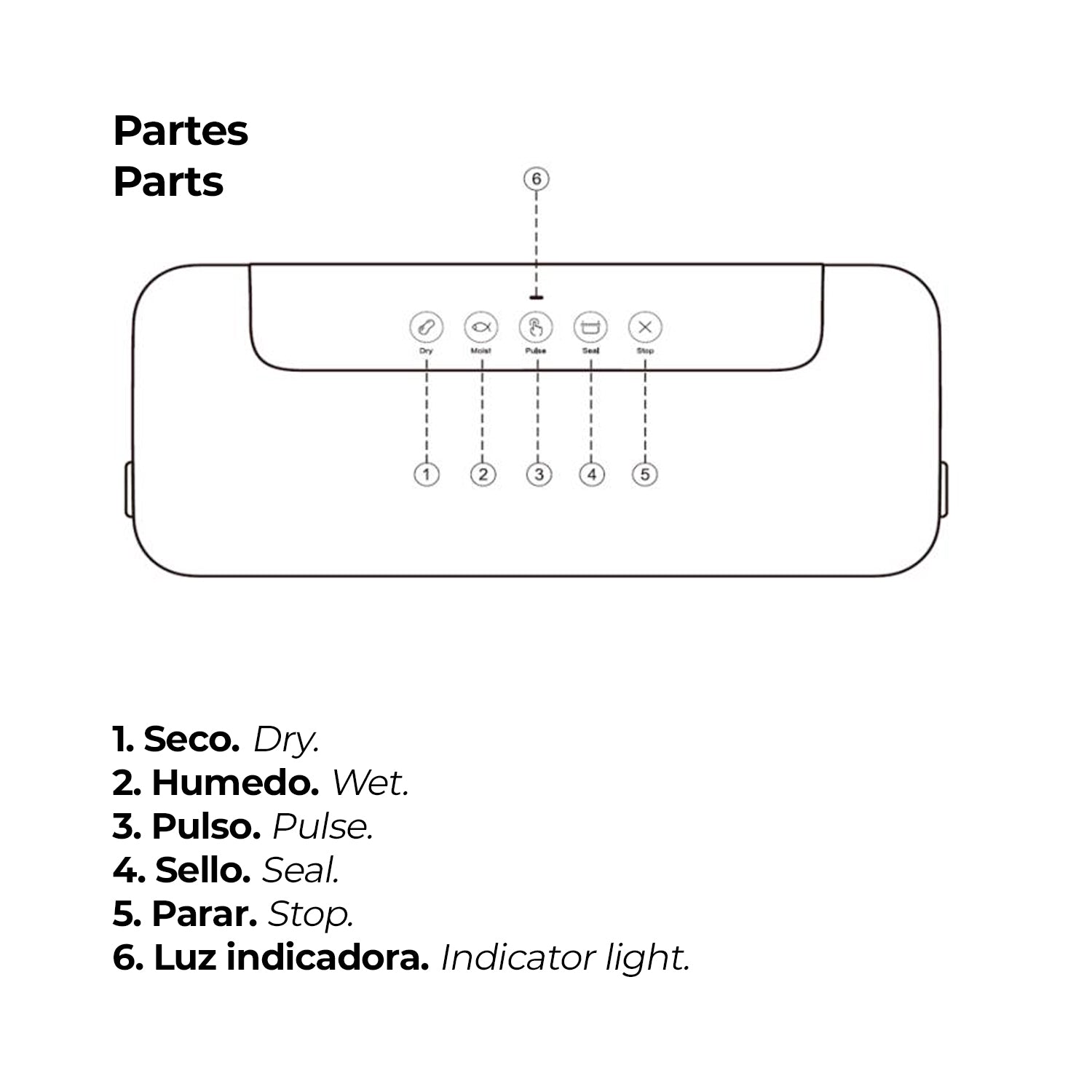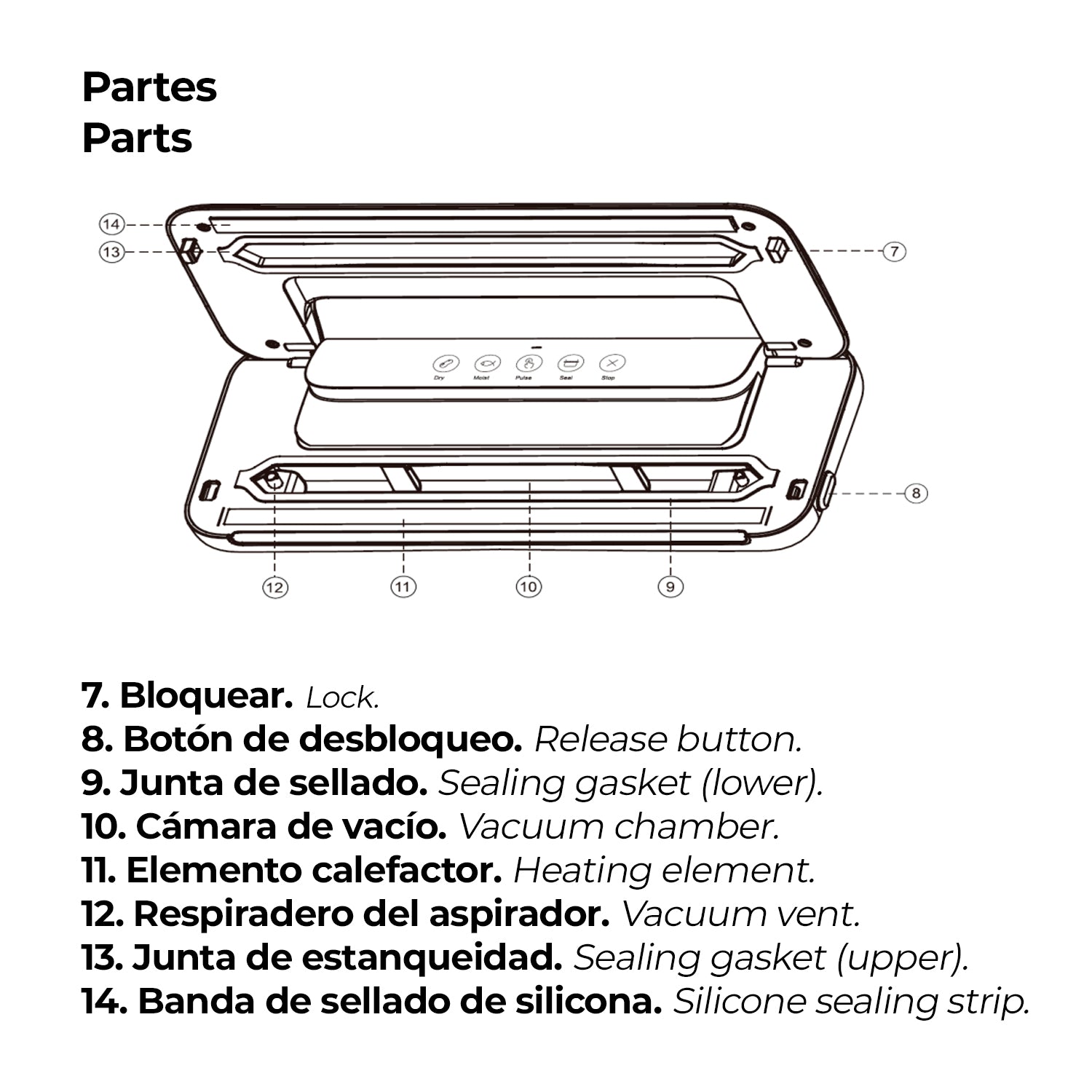 > La cámara de vacío puede atrapar líquidos extraídos de la bolsa, utilice un paño húmedo y tibio para limpiar el líquido. Seque bien.