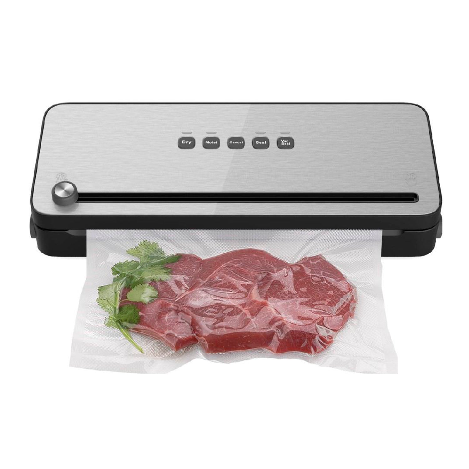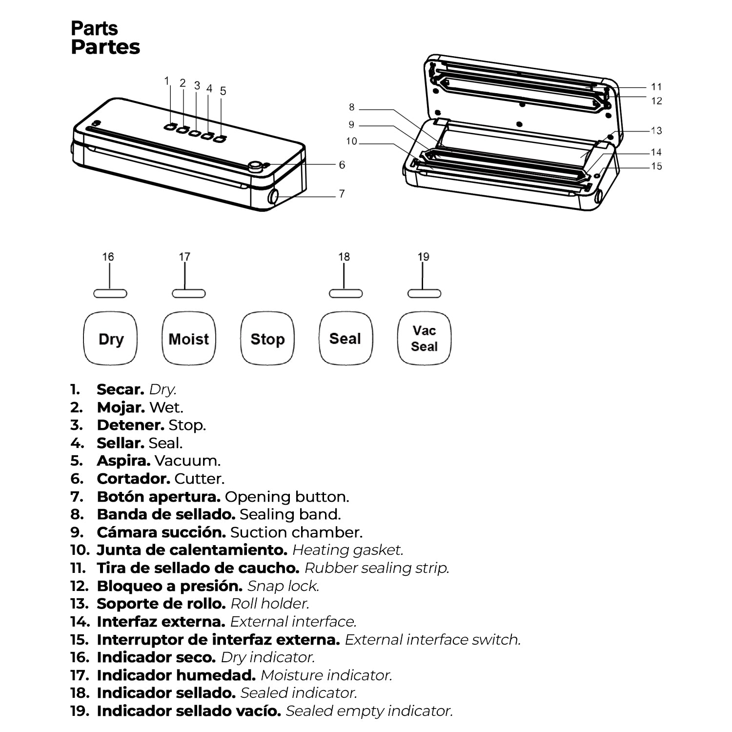 - Indicadores LED de alimentos seco, humedo, sellado, sellado con vacio.