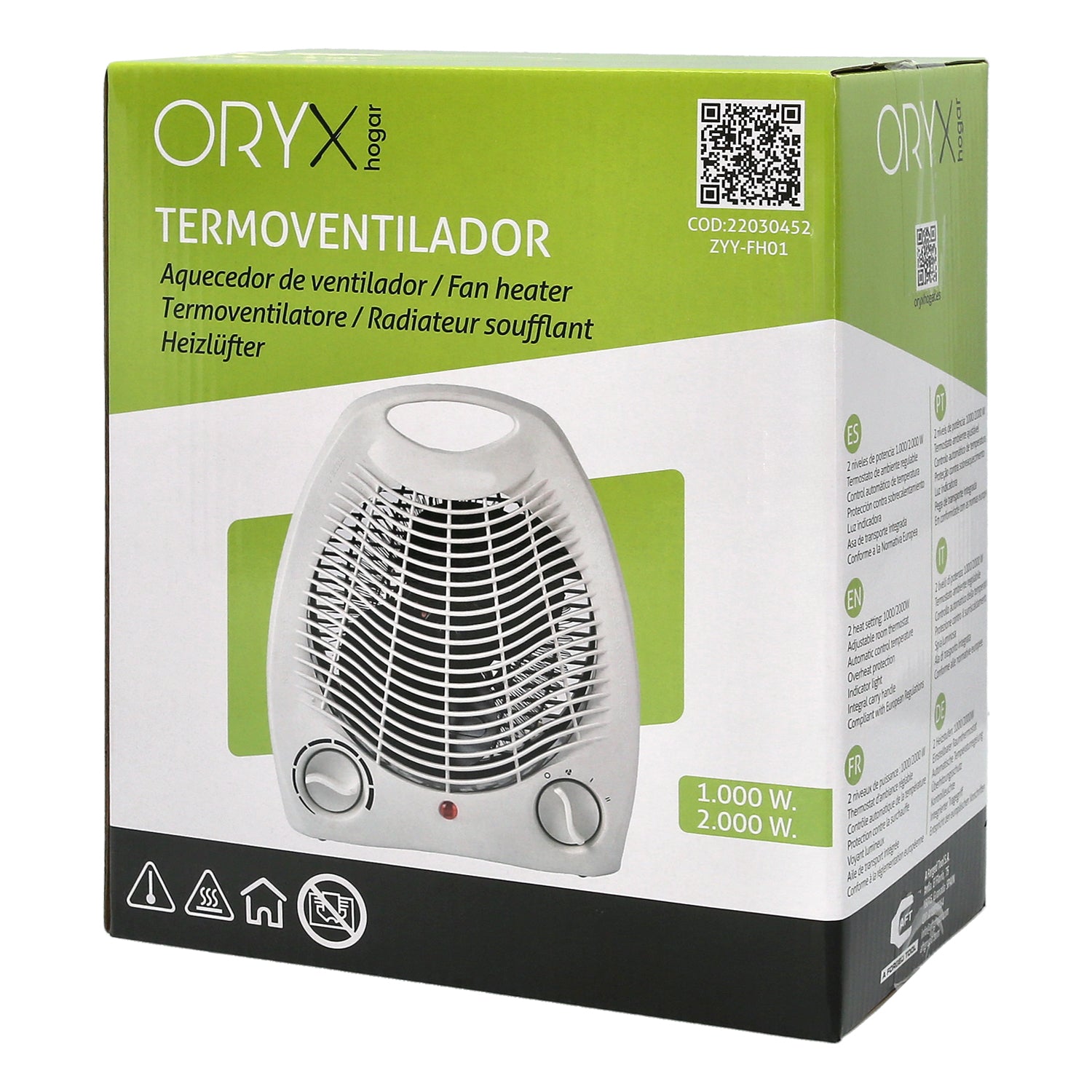 - Este versátil termoventilador cuenta con tres posiciones de calor: la primera ofrece aire frío, la segunda aire caliente a 1000 W y la tercera aire caliente a potentes 2000 W, adaptándose perfectamente a tus necesidades de calefacción.