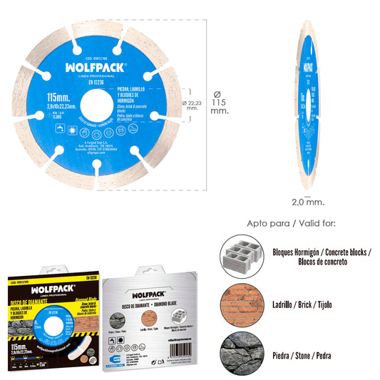 Disco Diamante Ø 115 mm. Piedra, Ladrillo, Refractarios, Bloques de Hormigon. Segmento Diamantado 10 mm.