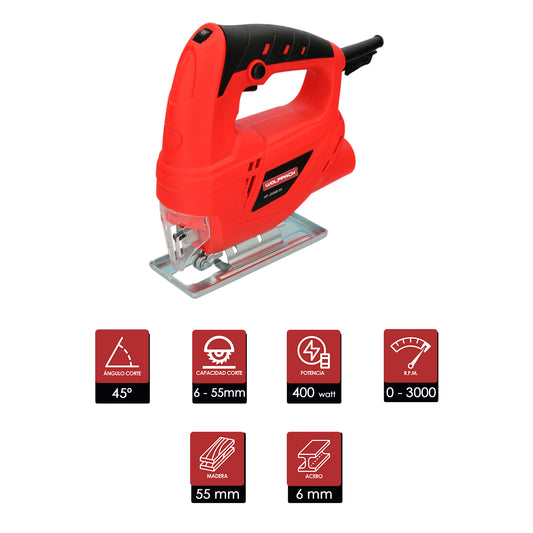 Serra alternativa 400 Watt. Serra vertical, profundidade de corte 55 mm. Madeira. inclinável