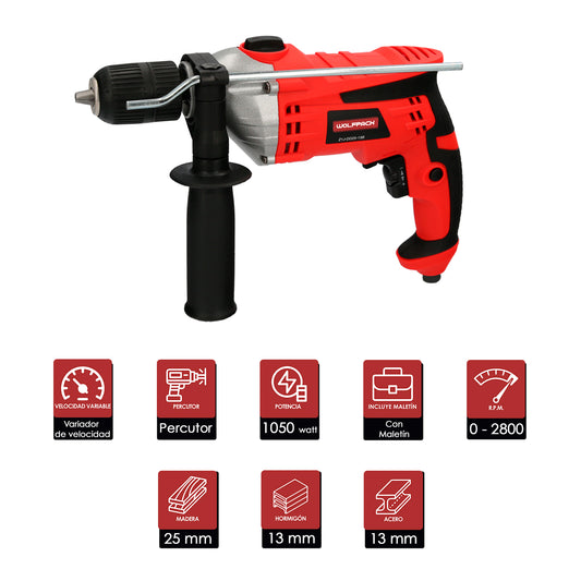 Furadeira Percussão Com Velocidade Variável 1050 Watt. Inclui maleta, alça e guia de metal.