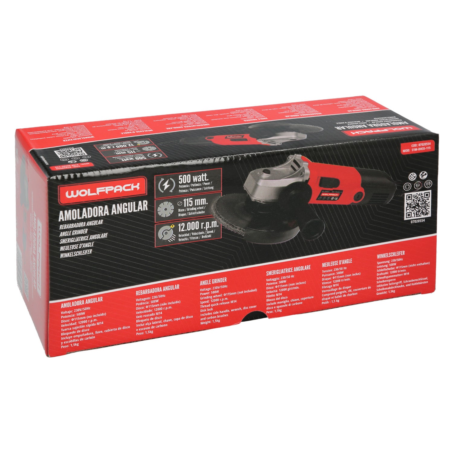 Amoladora 500 Watt. Ø 115 mm. 12.000 R.P.M. Eje M14 Protector Disco Ajustable, Anti arranque