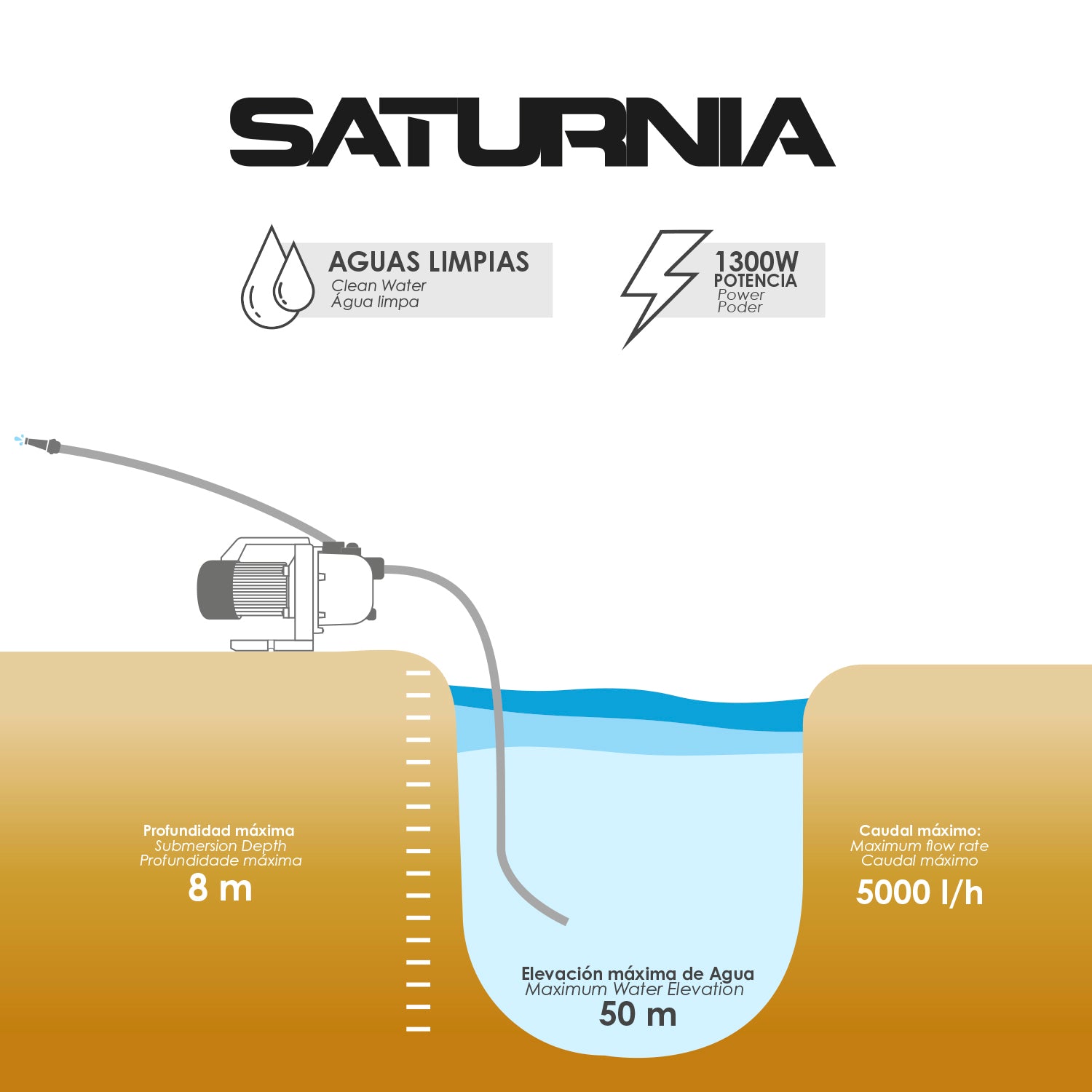 Bomba Aguas Limpias Superficie Acero Inoxidable 1.300 W. 5.000 lts/hora, Profundidad 8 Mts Elevación 50 mts. Presion Max: 5 Bar