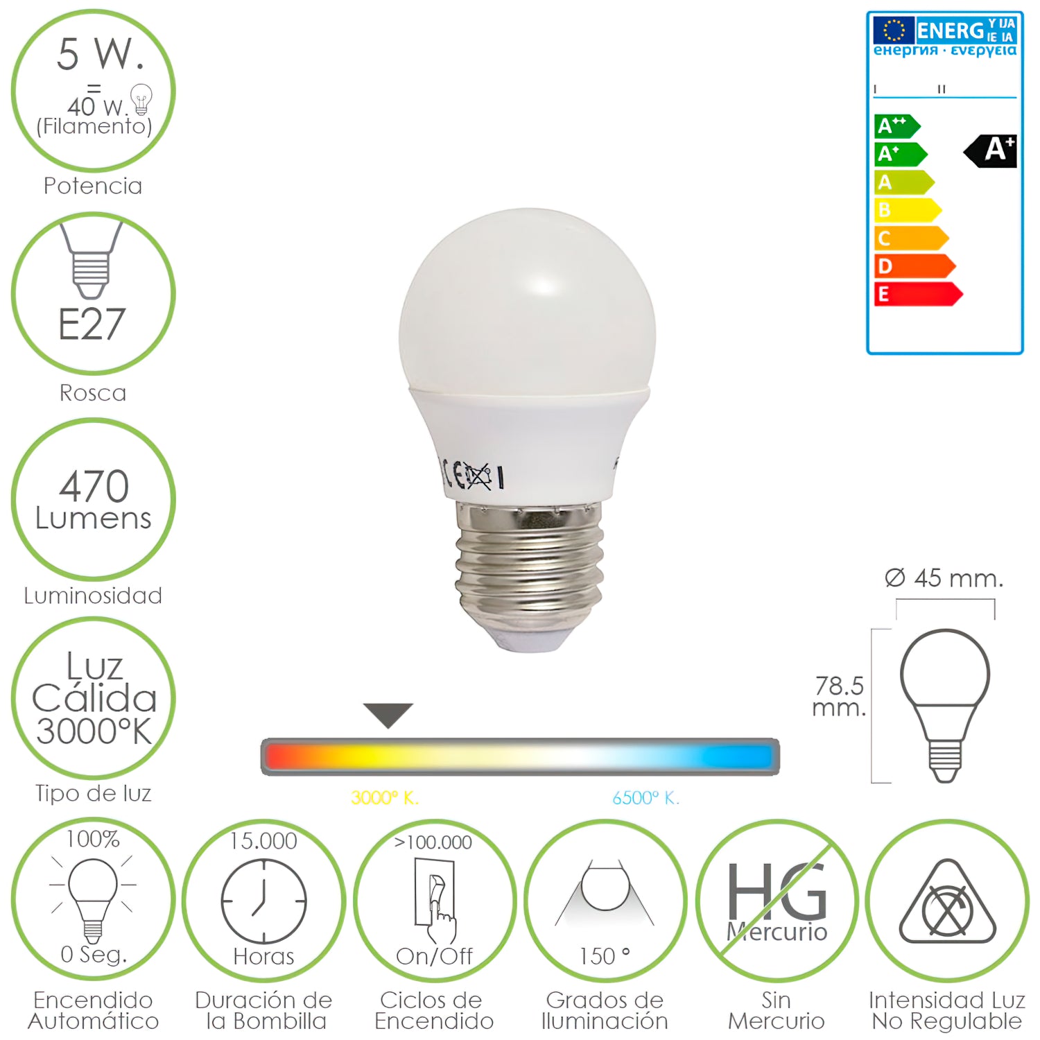 Lâmpada Led Esférica E27 5 W. - 40 W. 470 lumens. Luz quente (3.000 °K).