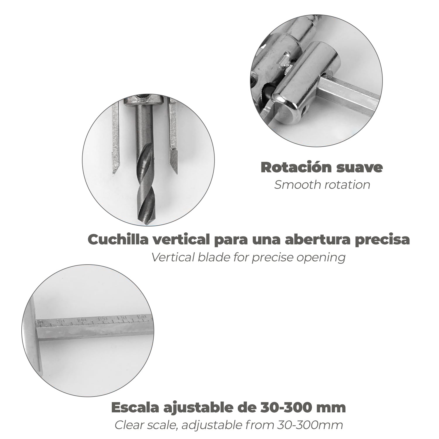 - Distancia del orificio ajustable entre 30 y 300 mm.