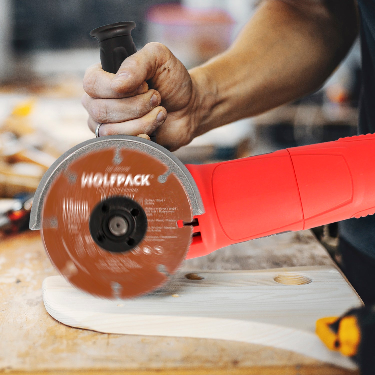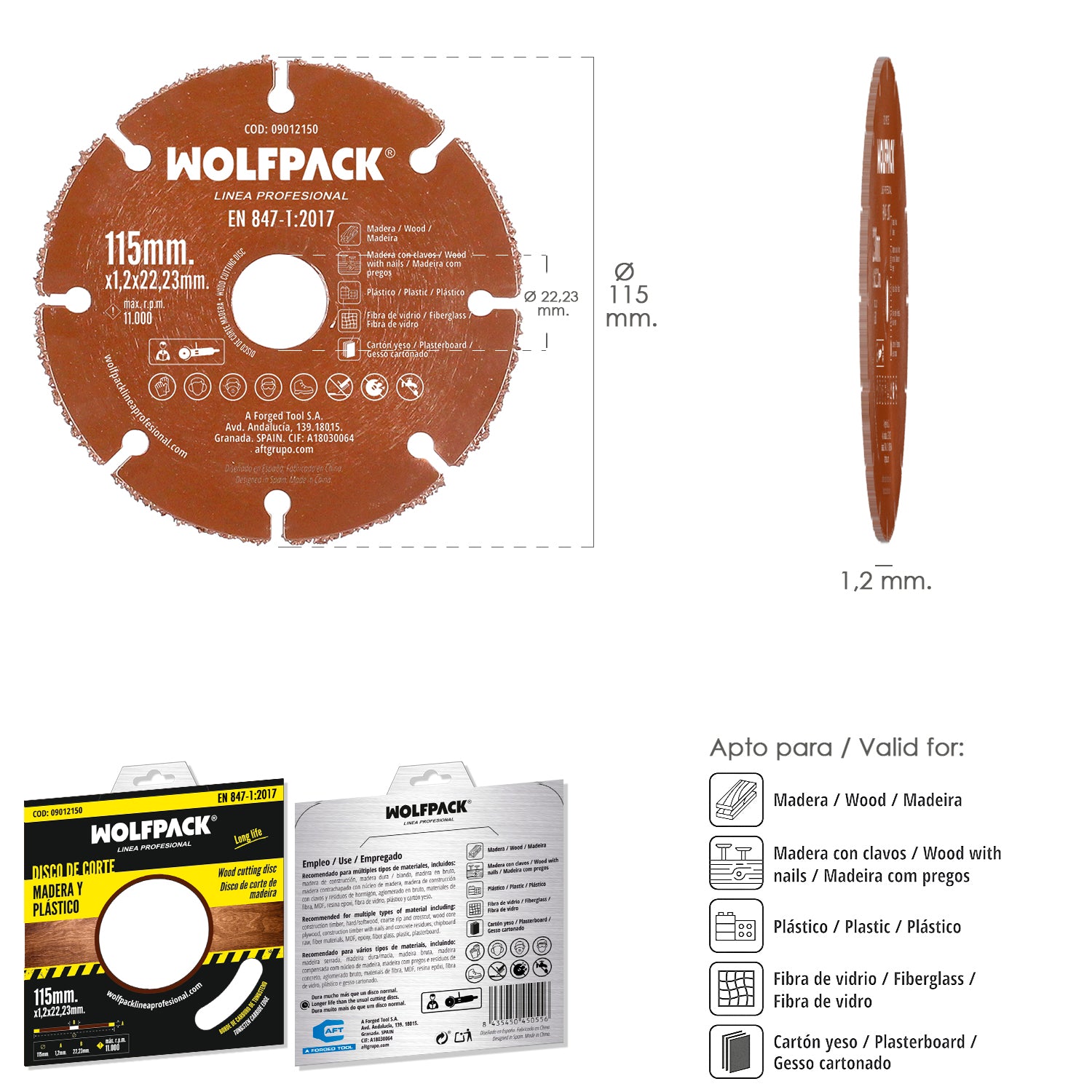 - Disco de corte com fio de carboneto de tungstênio, ideal para cortar materiais como madeira, plásticos, gesso cartonado, etc.