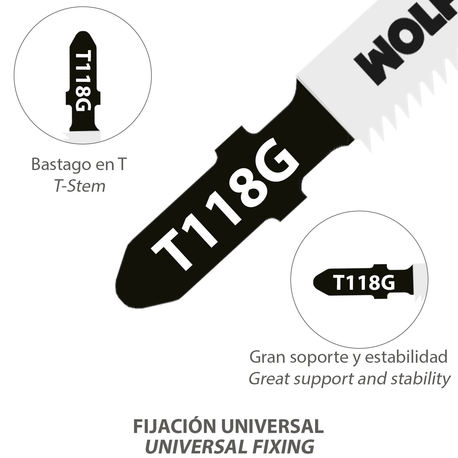 - Vastago en forma de T, compatible con la mayoría de modelos de sierra de calar.