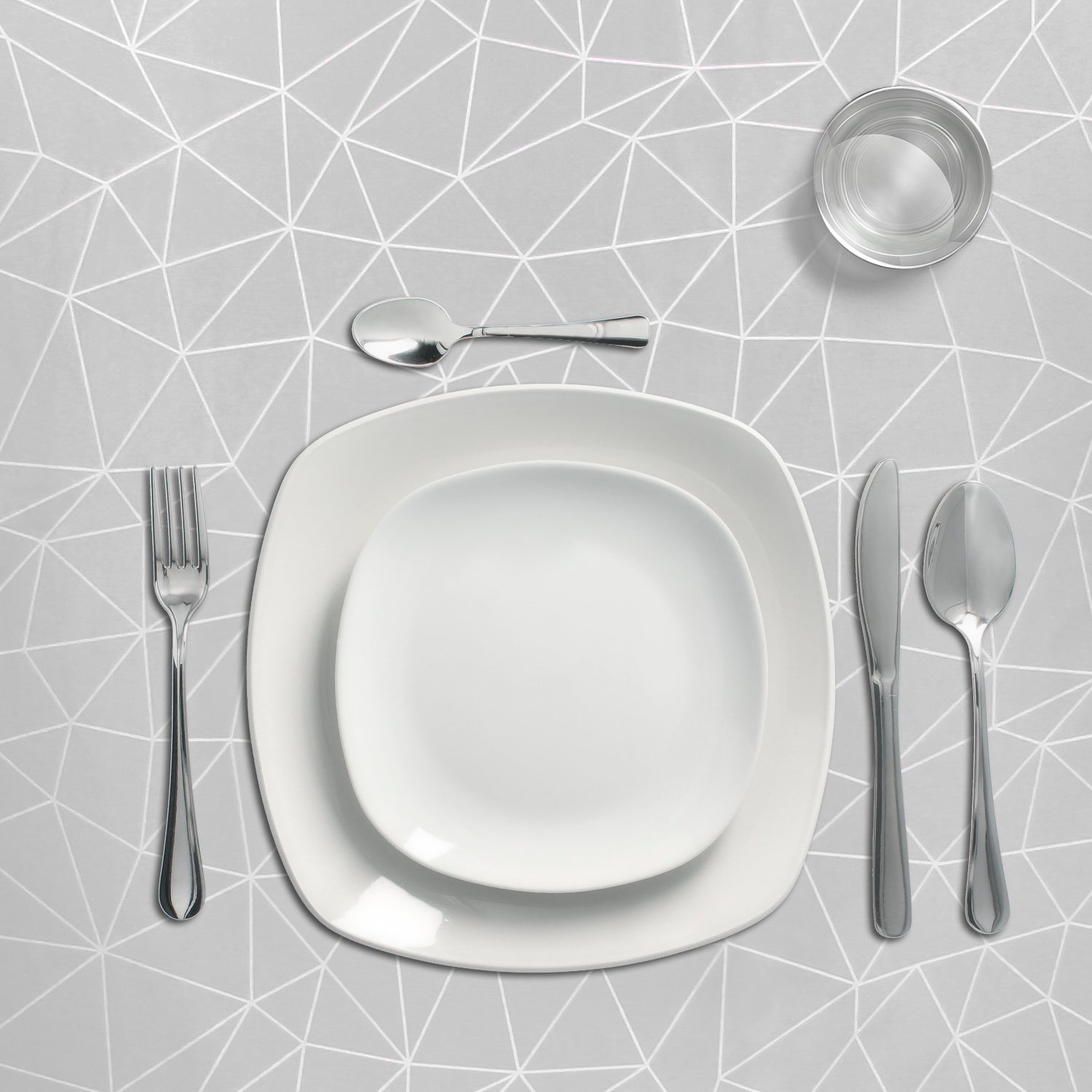 - Toalha de oleado estampada a cinzento com formas geométricas brancas. Design moderno e elegante para qualquer ocasião.