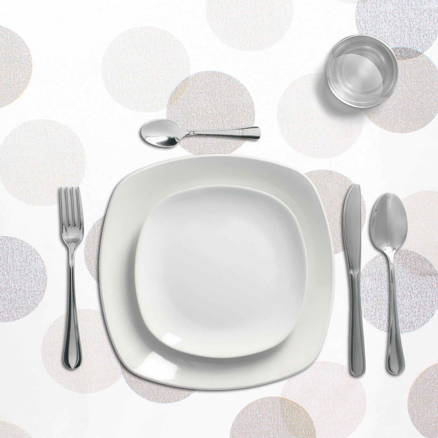 - Toalha de oleado estampada a branco com formas circulares em tons de cinza e bege. Design moderno e elegante para qualquer ocasião.