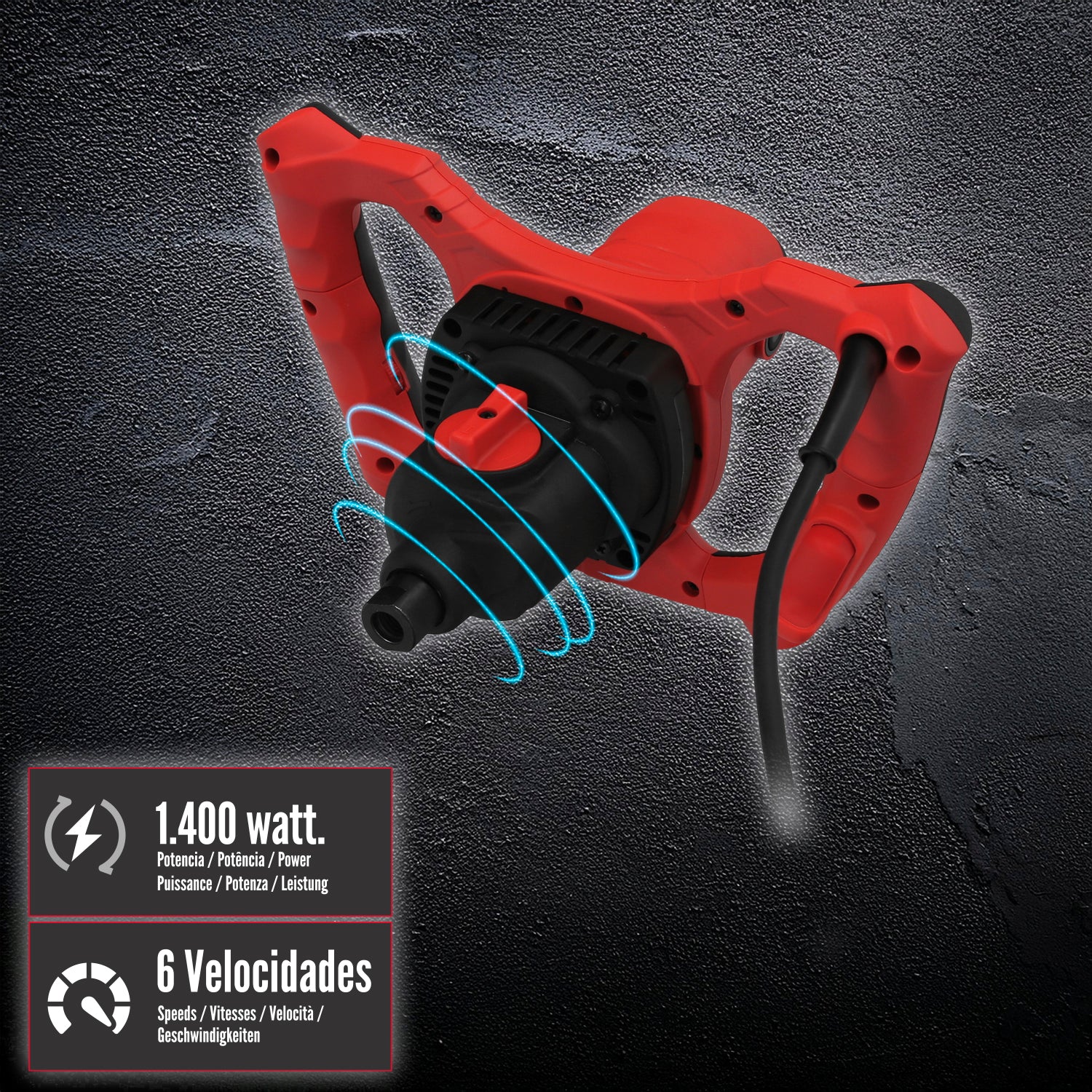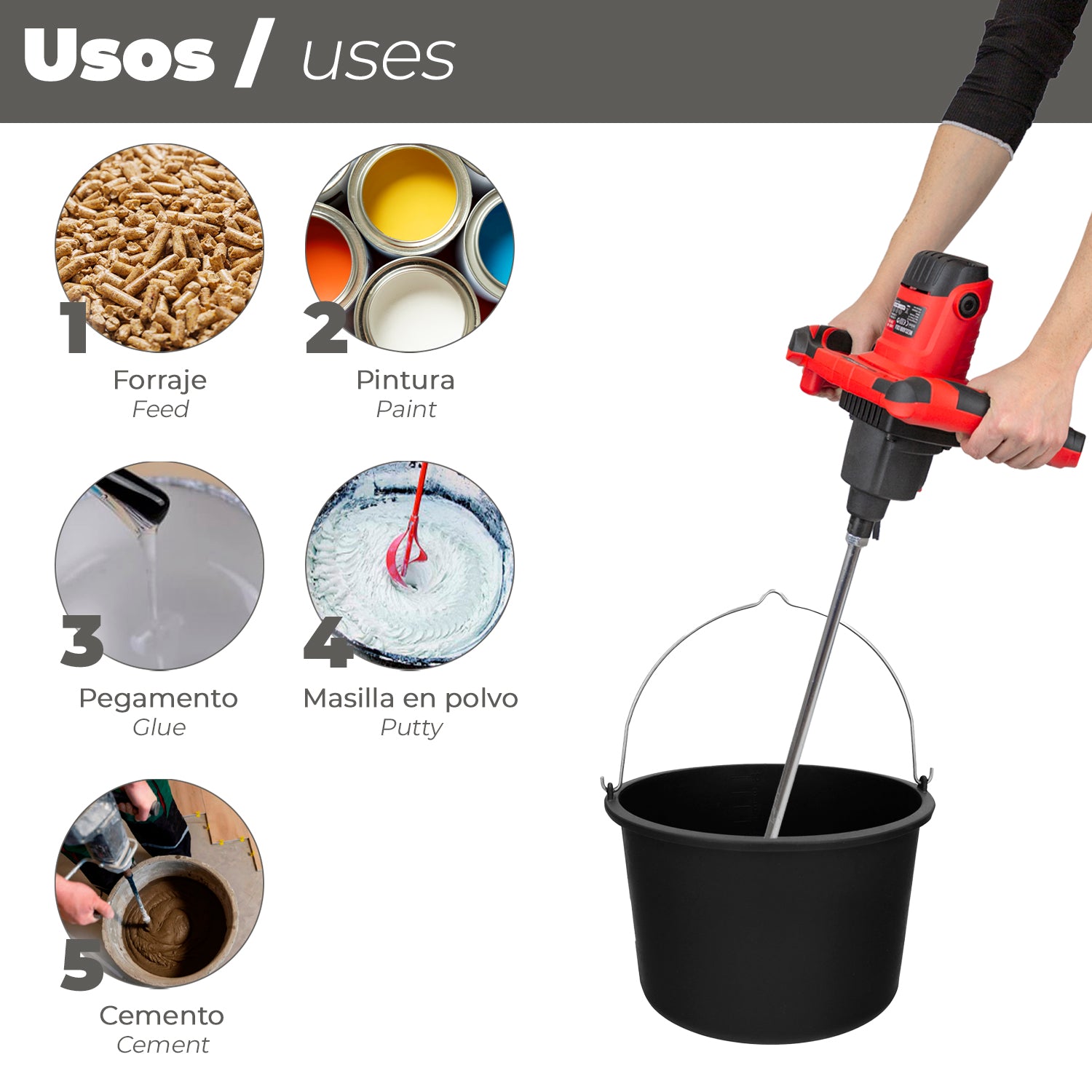 - Puede ser usador para mezclar cemento, cemento-cola, pinturas, mezcla, etc.