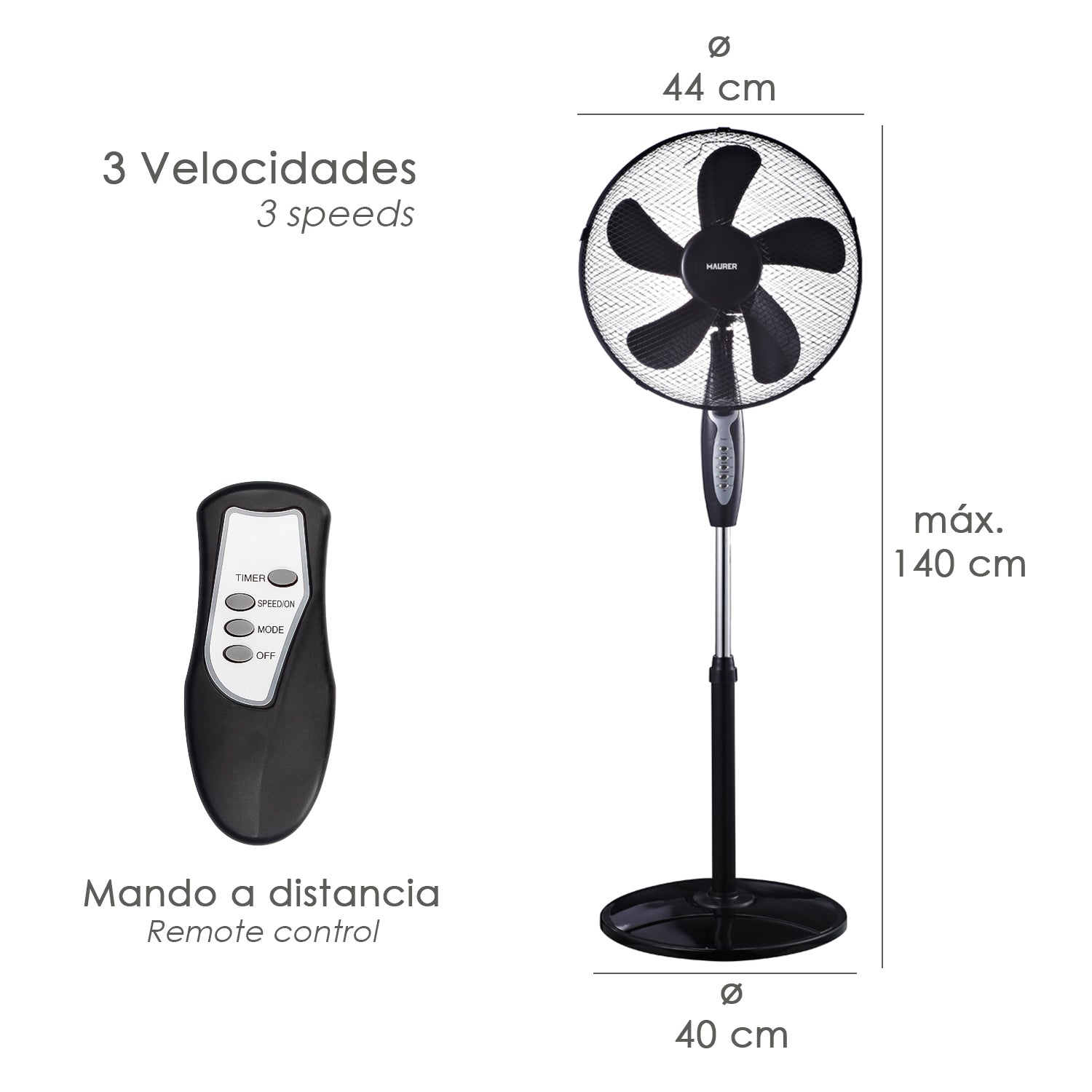 Ventilador de Pé Ø 40 Cm 45 Watt. 3 velocidades 5 lâminas de tamanho grande, 3 velocidades, com temporizador.